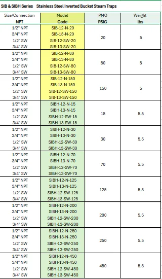 The SIB & SIBH Inverted Bucket Steam Traps were specifically designed for removing condensate from steam mains and steam supply lines. They can also be used on unit heaters, laundry equipment, and other smaller process applications. Maximum Steam Pressure is 450 PSIG. Available in 1/2″ and 3/4″ NPT and Socket Weld connections. The stainless steel body is seal welded and therefore these units are non-repairable.