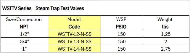 The WSTTV Steam Trap Test Valve offers simple, immediate, and visible diagnosis of any steam trap. Turning the handle 90˚ to the “Test” position will direct flow of steam trap out the test port for visual evaluation of discharge.