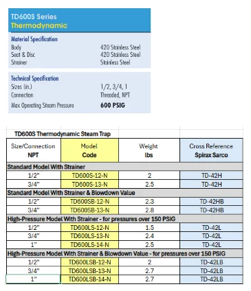 | TD600LSB | High-Pressure with Blowdown — Recommended over 150 PSIG |