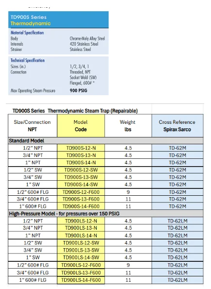 | TD900LS | High-Pressure Model — Recommended on pressures over 150 PSIG for improved efficiency |