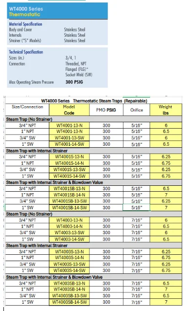 Draining condensate from steam mains and steam supply lines. They can also be used for steam tracing applications. The WT4000 is a High-Capacity Thermostatic steam trap and was specifically designed for removing condensate and air from larger process applications.