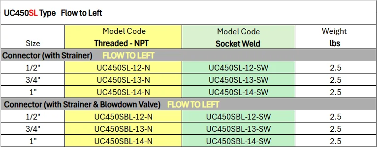 - UC450SBL — Flow to Left with Strainer & Blowdown Valve