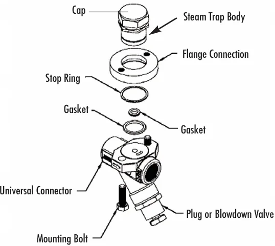 The QUICK-CHANGE Universal Trap-Connector System with multiple choices for trap modules and multiple choices for connectors are used in steam systems where a simplified and economical maintenance program of steam traps is desired.
