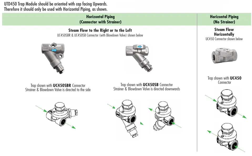 The UTD450 Thermodynamic Trap Modules were designed to work as drip traps for the draining of condensate from steam mains and other steam supply lines. This model is only recommended for horizontal piping installations; cap should be oriented upwards. These trap modules mount to any 2-bolt Quick-Change Universal Connector. UTD450L is the Low-Capacity Model. Max Operating Pressure is 450 PSIG.