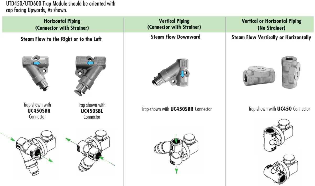 & UTD600LSM PMO PSIG: 450 & 600 The QUICK-CHANGE Universal Trap-Connector System with multiple choices for trap modules and multiple choices for connectors are used in steam systems where a simplified and economical maintenance program of steam traps is desired.